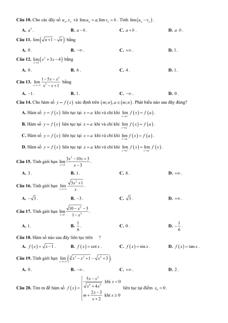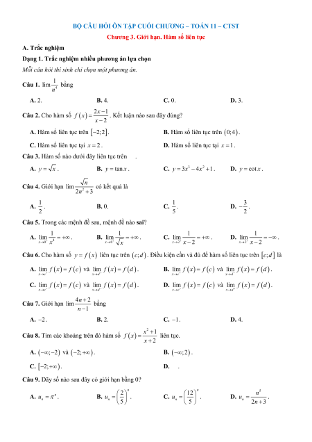 Chương 3. Giới hạn. Hàm số liên tục A. Trắc nghiệm