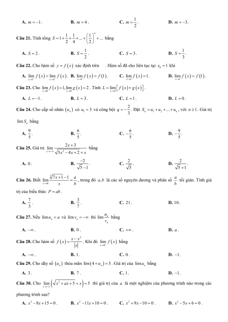 liên tục tại điểm x 0 . 0 2x 3 m khi x 0 x 2 A. m 1. B. m 4 . C. 1 m . D. m 3 . 2 n Câu 21. Tính tổng 1 1 1 S 1 . . . . bằng 2 4 2 A. S 2 . B. 1 S . C. S 3. D. 1 S . 2 3