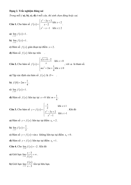 a) Hàm số y f x liên tục tại điểm x 2 . 0 b) f x 1 lim . x 1 2