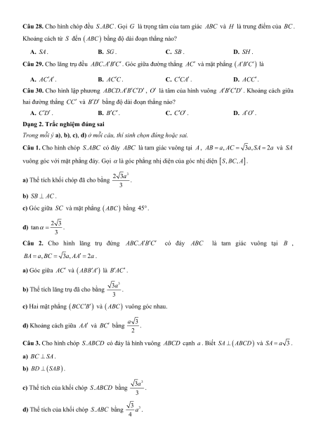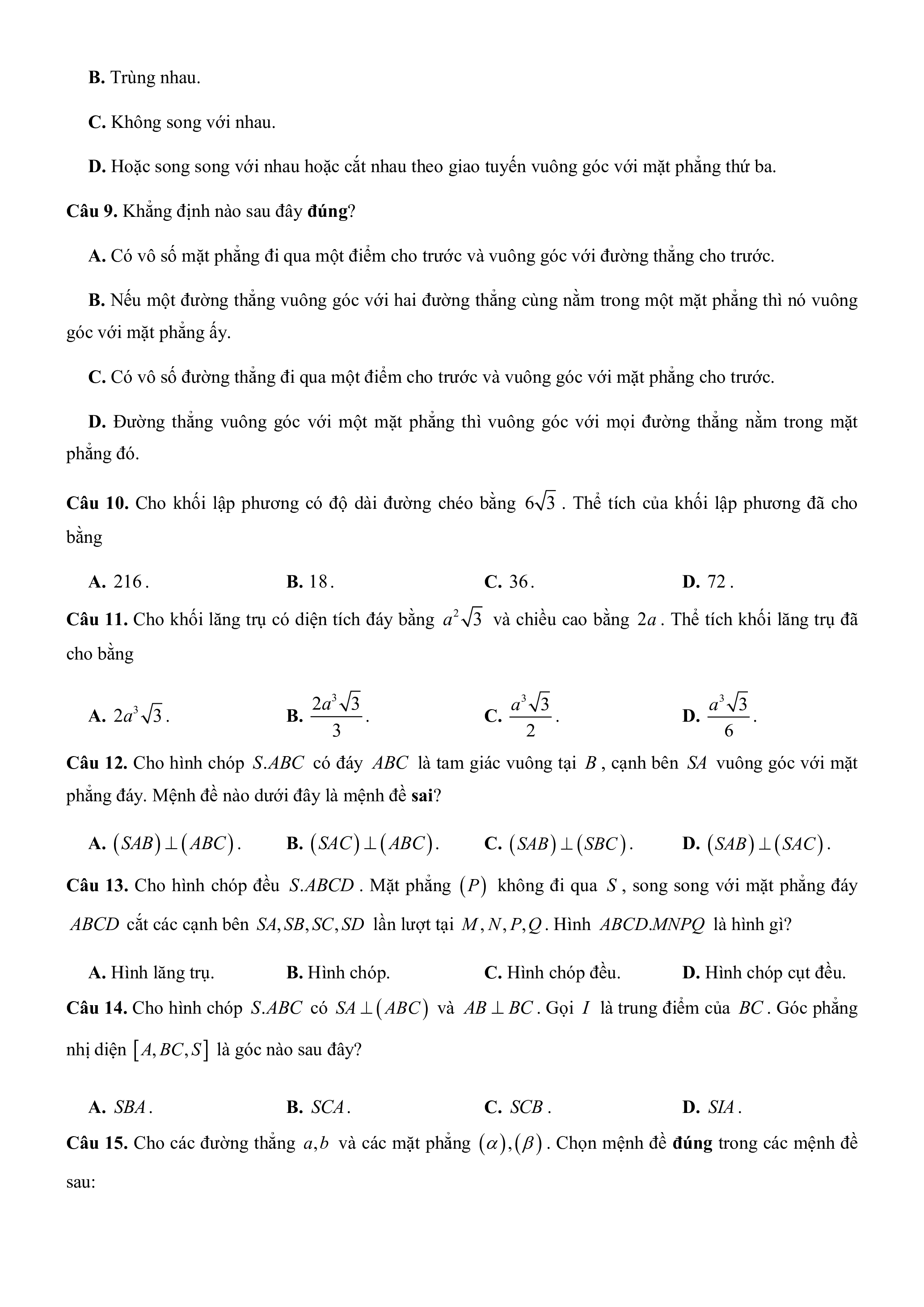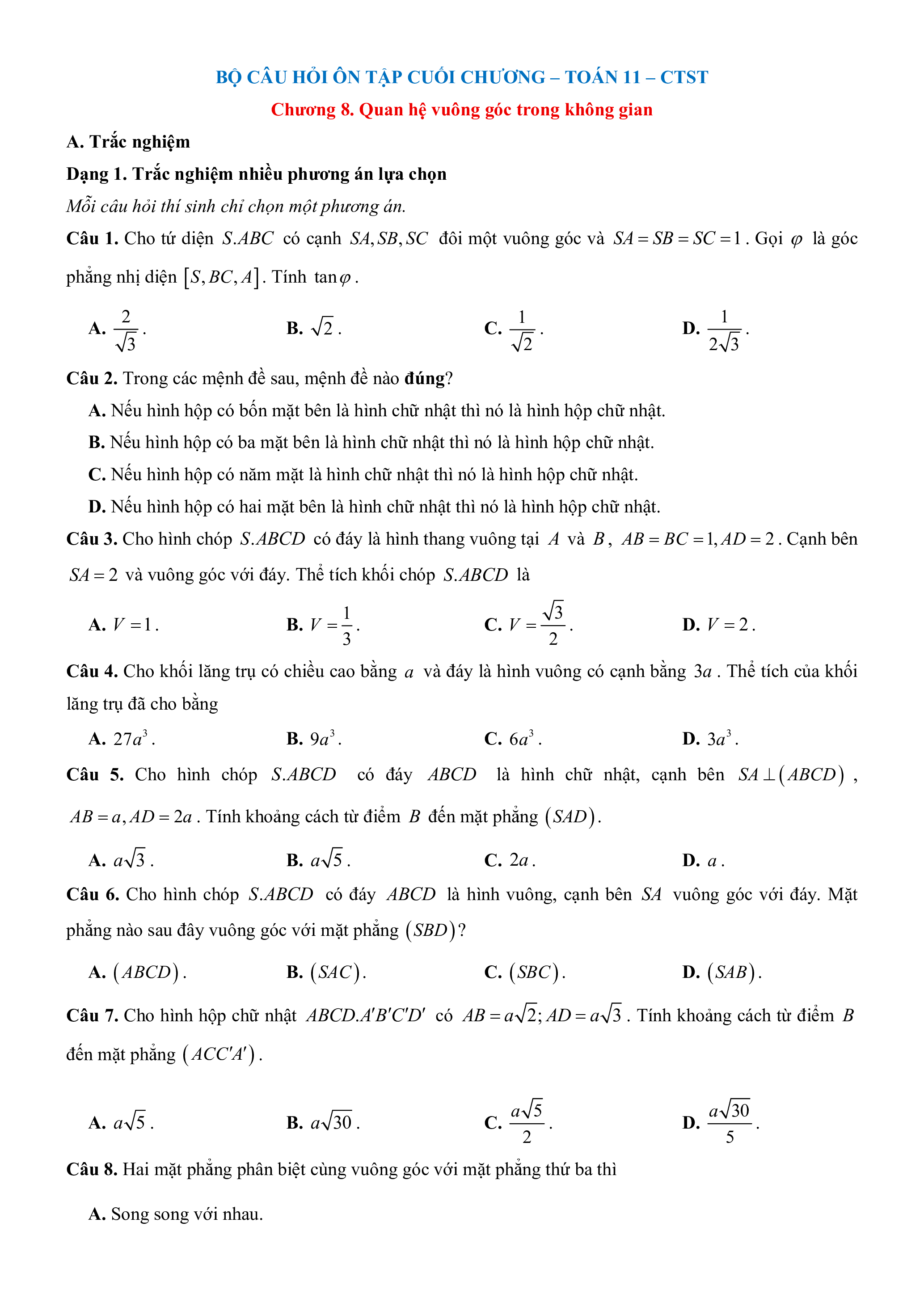 Chương 8. Quan hệ vuông góc trong không gian A. Trắc nghiệm