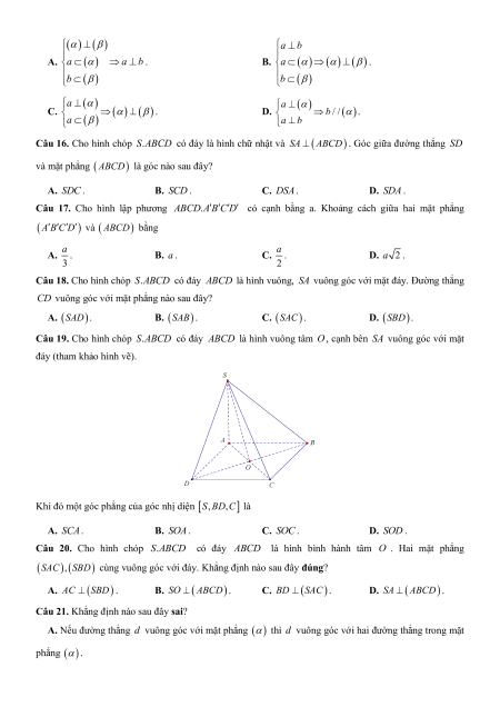 Câu 19. Cho hình chóp S.ABCD có đáy ABCD là hình vuông tâm O , cạnh bên SA vuông góc với mặt