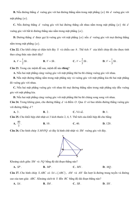 Câu 26. Cho hình chóp S.MNPQ có đáy là hình chữ nhật và SM vuông góc với đáy.
