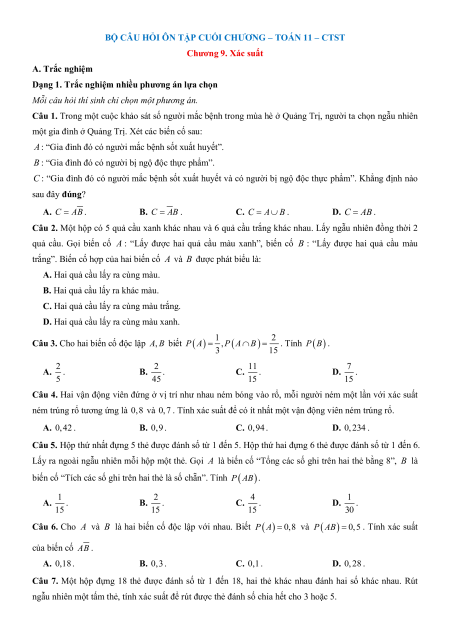 BỘ CÂU HỎI ÔN TẬP CUỐI CHƯƠNG – TOÁN 11 – CTST Chương 9. Xác suất A. Trắc nghiệm