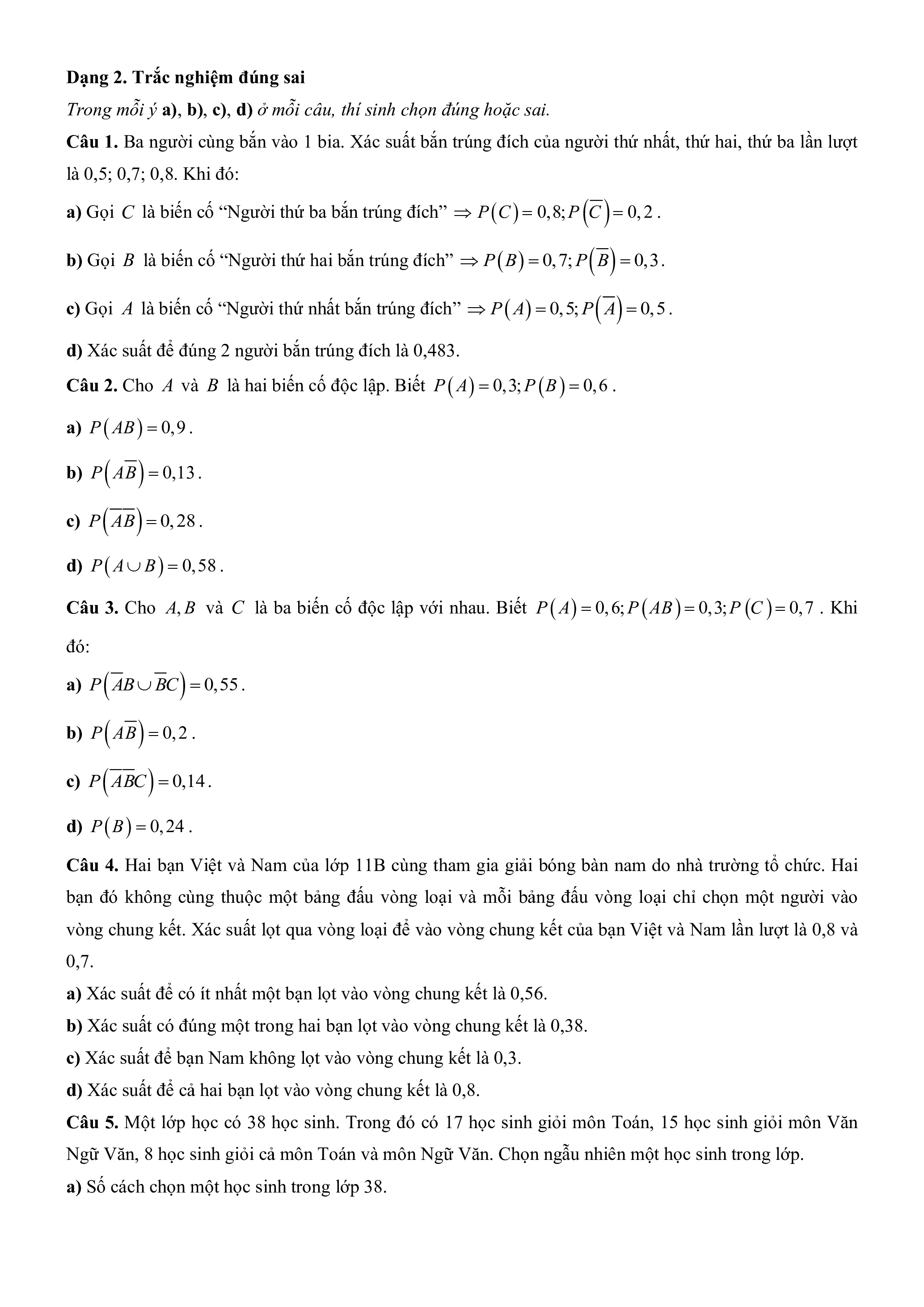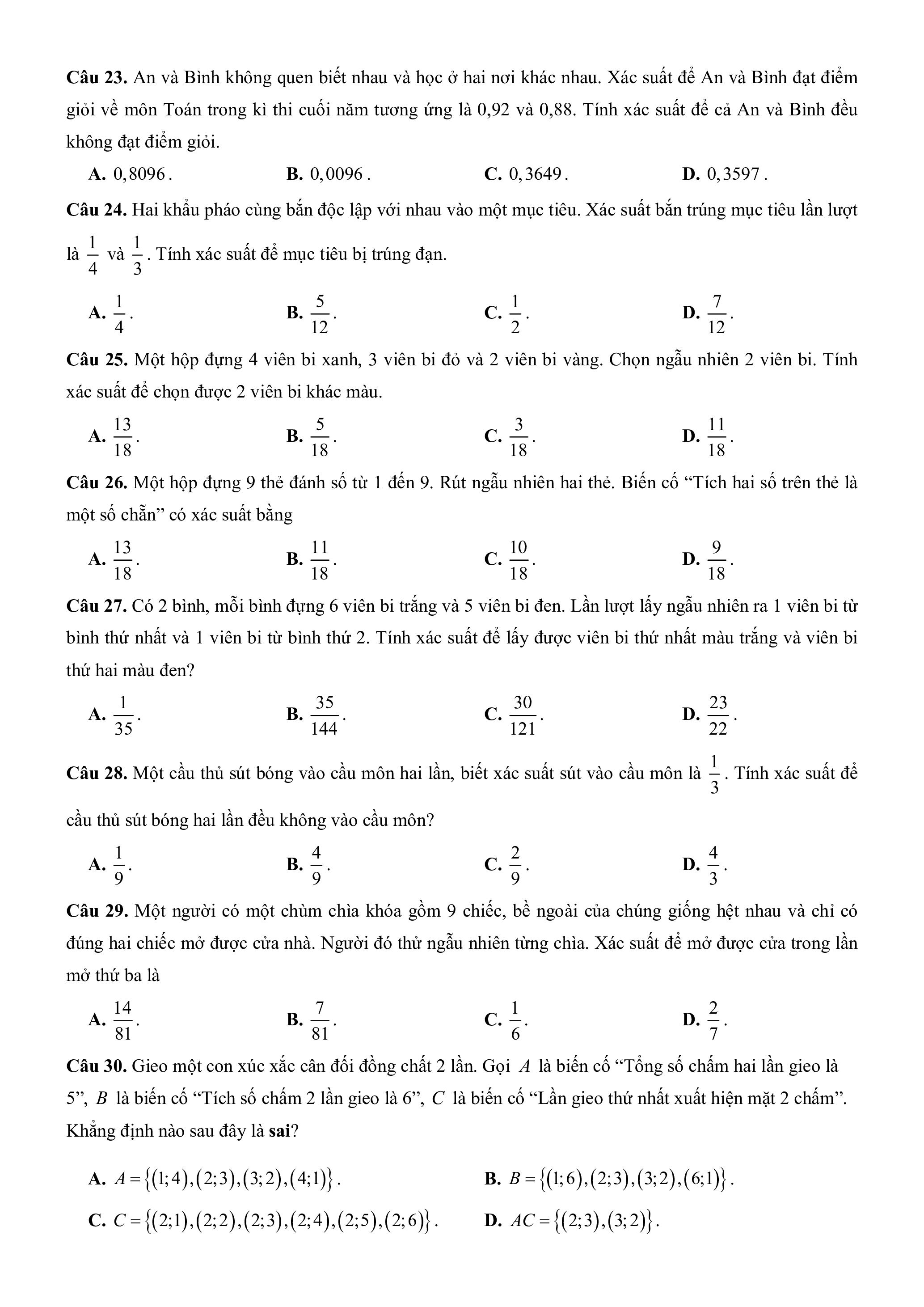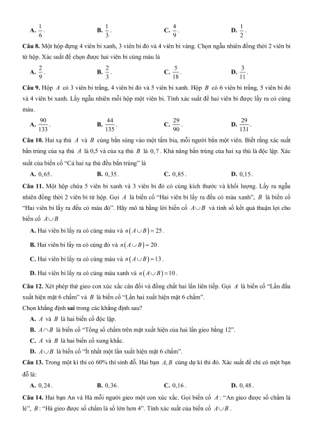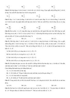 Câu 6. Cho A và B là hai biến cố độc lập với nhau. Biết P A 0,8 và P AB 0,5 . Tính xác suất của biến cố AB . A. 0,18. B. 0,3. C. 0,1. D. 0,28 .