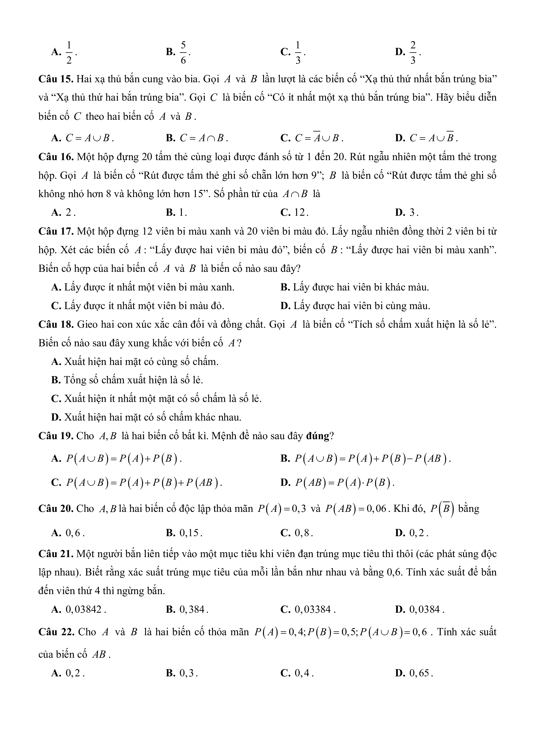 Câu 15. Hai xạ thủ bắn cung vào bia. Gọi A và B lần lượt là các biến cố “Xạ thủ thứ nhất bắn trúng bia”