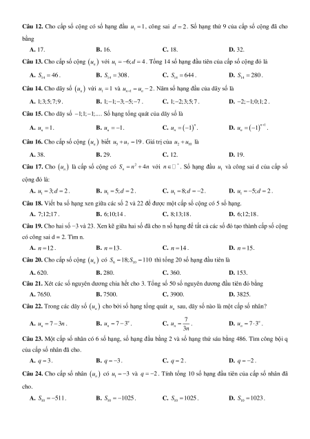 Câu 18. Viết ba số hạng xen giữa các số 2 và 22 để được một cấp số cộng có 5 số hạng. A. 7;12;17 . B. 6;10;14 . C. 8;13;18 . D. 6;12;18 .