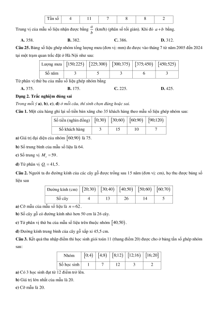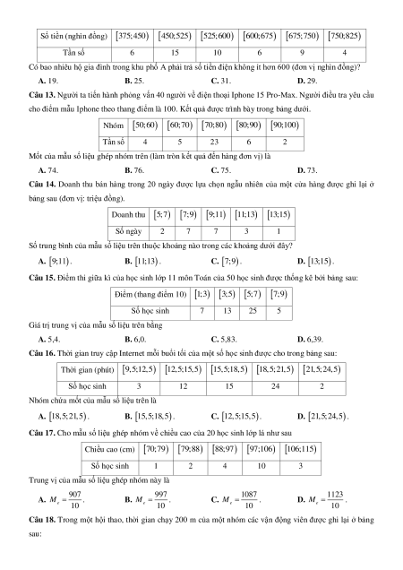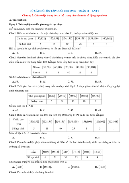 Chương 3. Các số đặc trưng đo xu thế trung tâm của mẫu số liệu ghép nhóm A. Trắc nghiệm