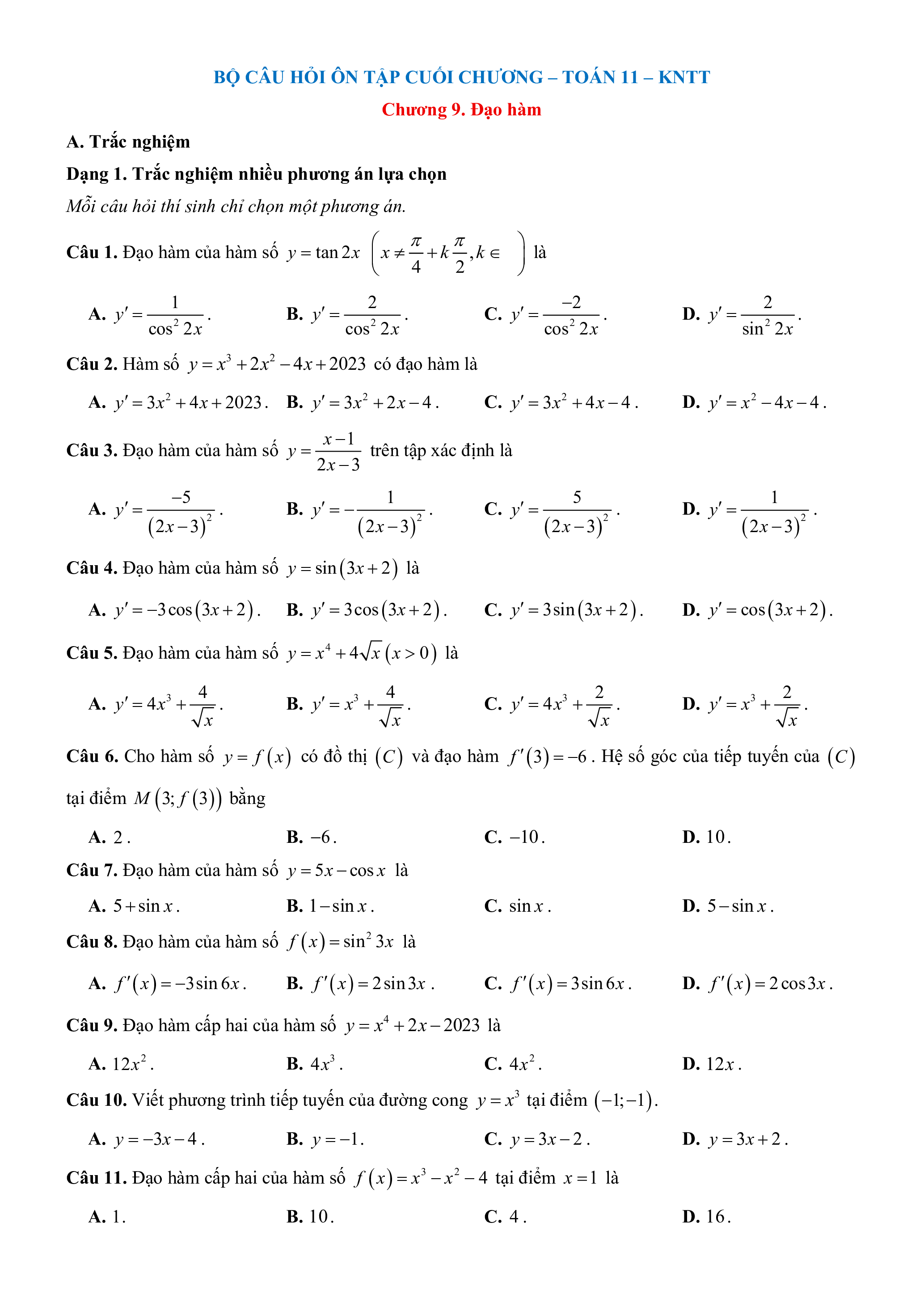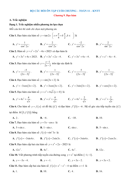 BỘ CÂU HỎI ÔN TẬP CUỐI CHƯƠNG – TOÁN 11 – KNTT Chương 9. Đạo hàm A. Trắc nghiệm