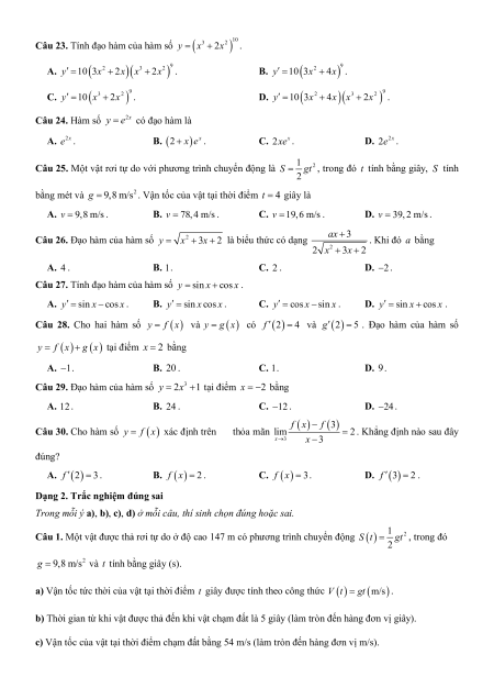 Câu 28. Cho hai hàm số y f x và y g x có f 2 4 và g2 5 . Đạo hàm của hàm số