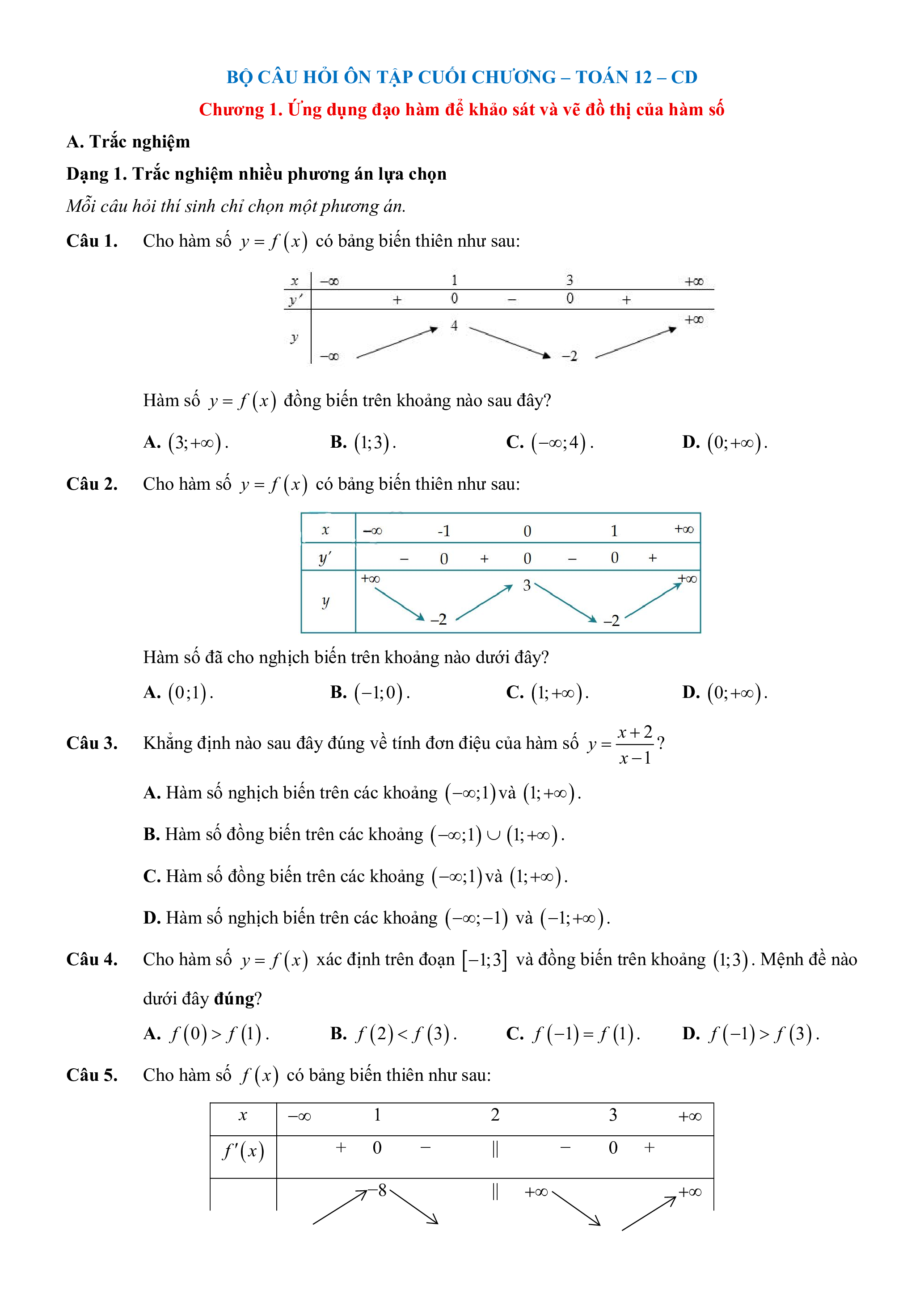 Chương 1. Ứng dụng đạo hàm để khảo sát và vẽ đồ thị của hàm số A. Trắc nghiệm