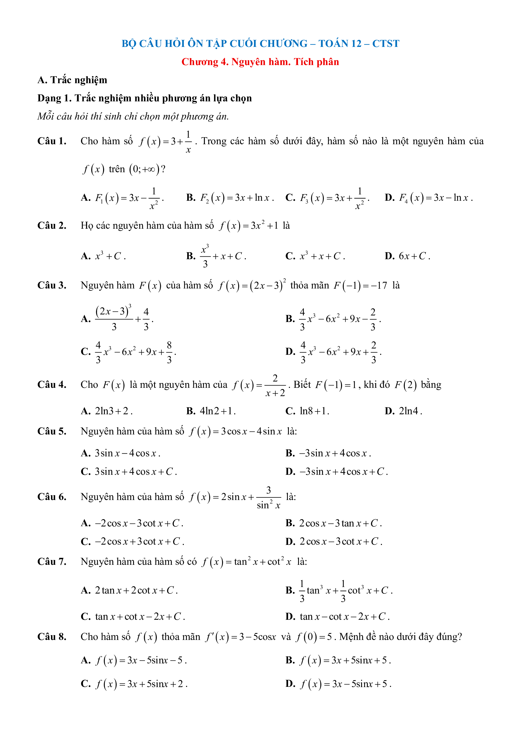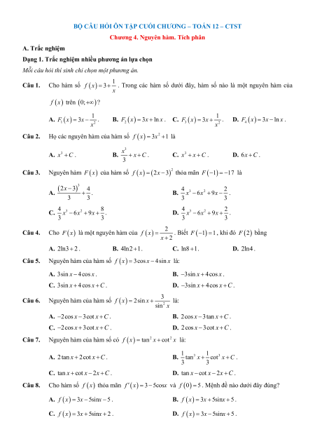Chương 4. Nguyên hàm. Tích phân A. Trắc nghiệm