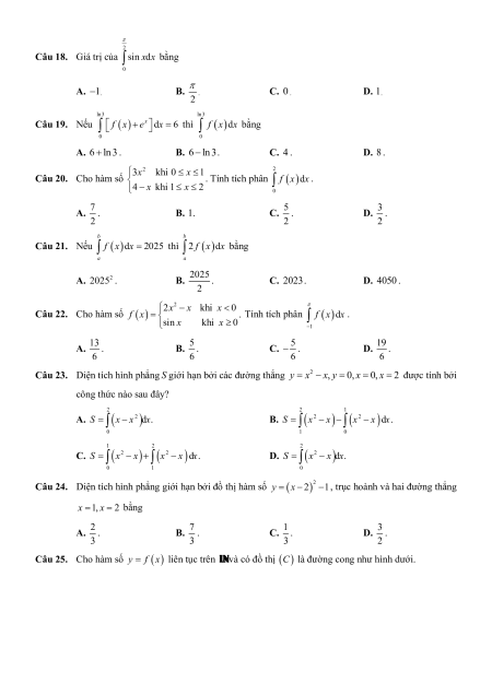 Câu 18. Giá trị của sin d x x bằng 0 A. 1 . B. 2 . C. 0 . D. 1. ln3 ln3 Câu 19. Nếu x