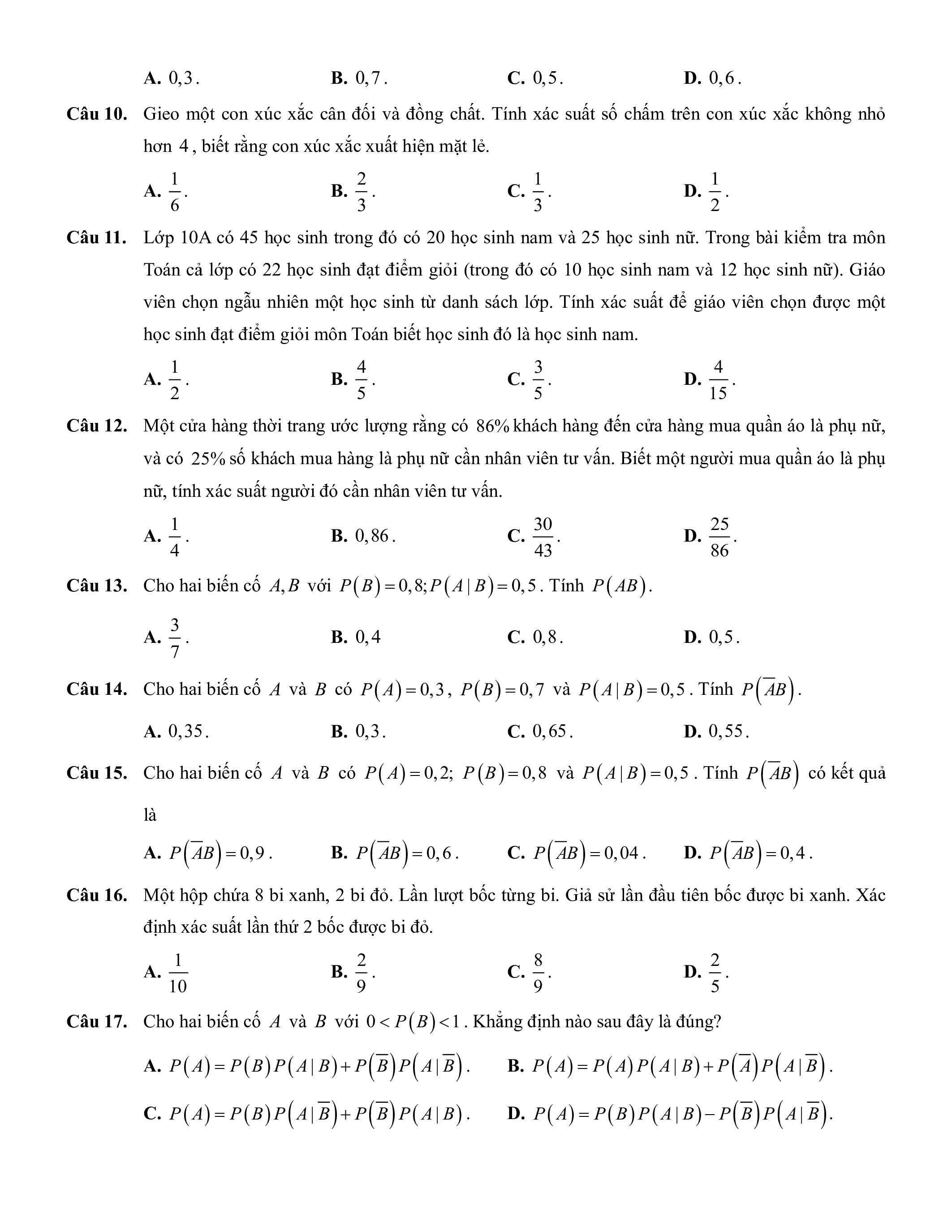 Chương 6. Xác suất có điều kiện A. Trắc nghiệm