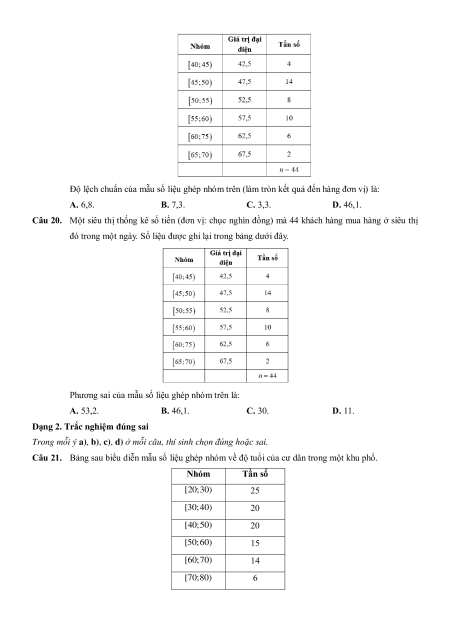 Câu 19. Một siêu thị thống kê số tiền (đơn vị: chục nghìn đồng) mà 44 khách hàng mua hàng ở siêu thị