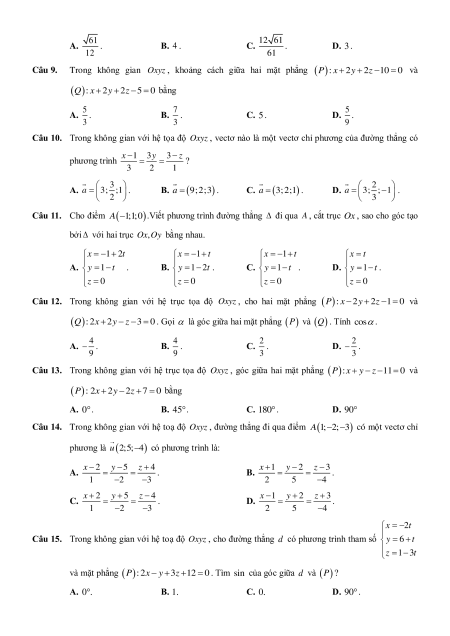 . Khoảng cách từ O đến bằng 61 12 61 A. . B. 4 . C. . D. 3 . 12 61 Câu 9.
