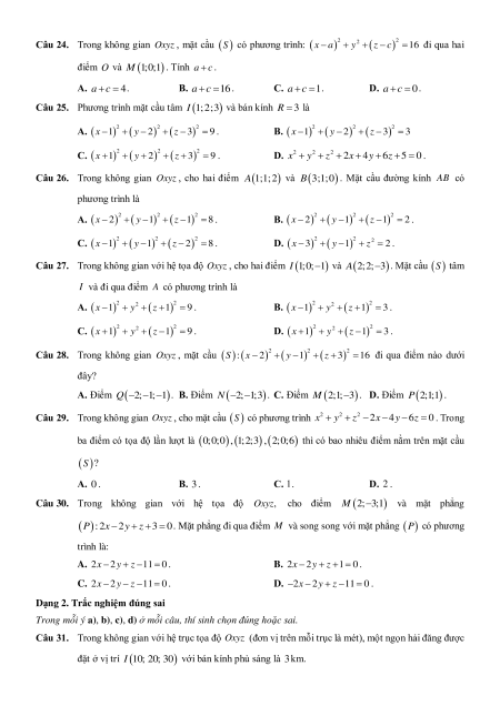 Câu 23. Trong không gian Oxyz , phương trình nào trong các phương trình sau là phương trình của một mặt cầu? A. S 2 2 2