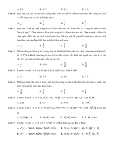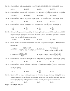A B thỏa mãn PB 0,5; P AB 0,3 thì P AB bằng: 3 4 1 3 A. . B. . C. . D. . 20 5 5 5 Câu 8.