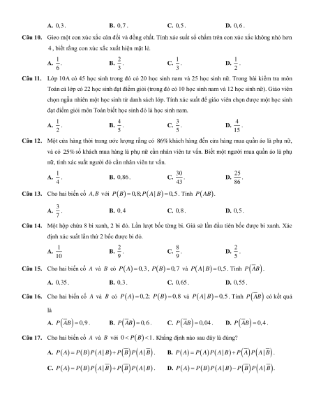 Cho hai biến cố A và B với PB 0,5, P A B 0,2. Tính P A | B. A. 0, 4 . B. 0,1 . C. 0, 6 . D. 0, 3 . Câu 7. Nếu hai biến cố ,