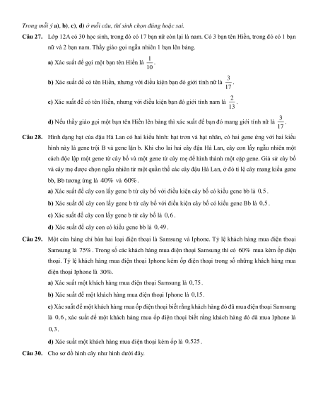 Trong mỗi ý a), b), c), d) ở mỗi câu, thí sinh chọn đúng hoặc sai.