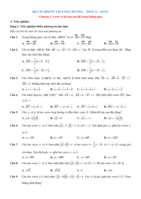 Chương 2. Vectơ và hệ trục tọa độ trong không gian A. Trắc nghiệm