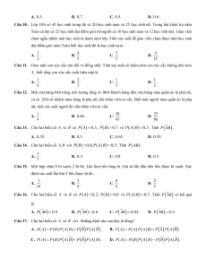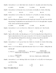 A B thỏa mãn PB 0,5; P AB 0,3 thì P AB bằng: 3 4 1 3 A. . B. . C. . D. . 20 5 5 5 Câu 8.