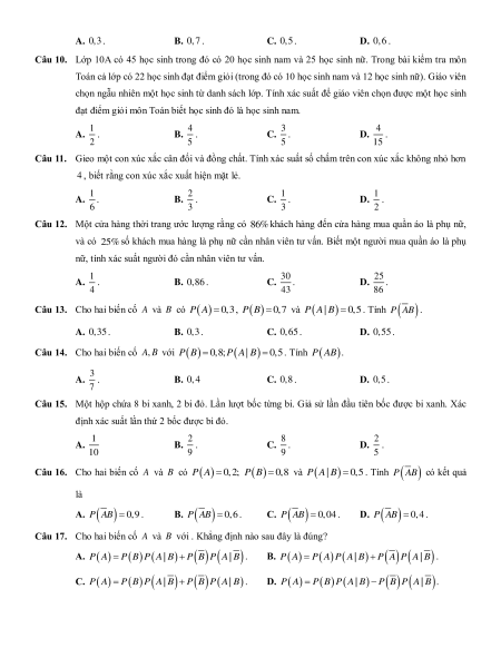 Cho hai biến cố A và B với PB 0,5, P A B 0,2. Tính P A | B. A. 0, 4 . B. 0,1 . C. 0, 6 . D. 0,3 . Câu 9.