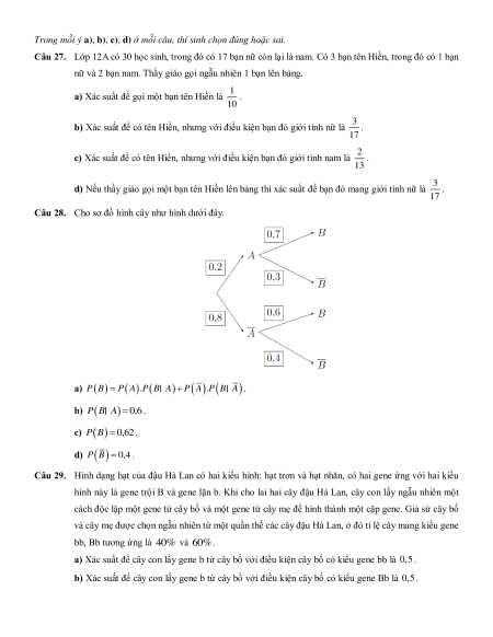 Trong mỗi ý a), b), c), d) ở mỗi câu, thí sinh chọn đúng hoặc sai.