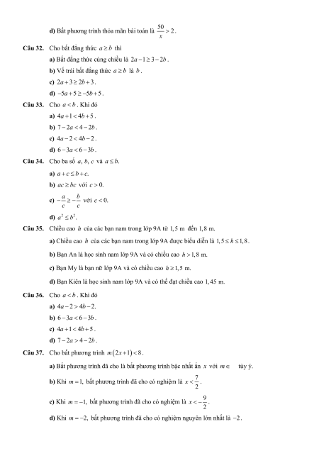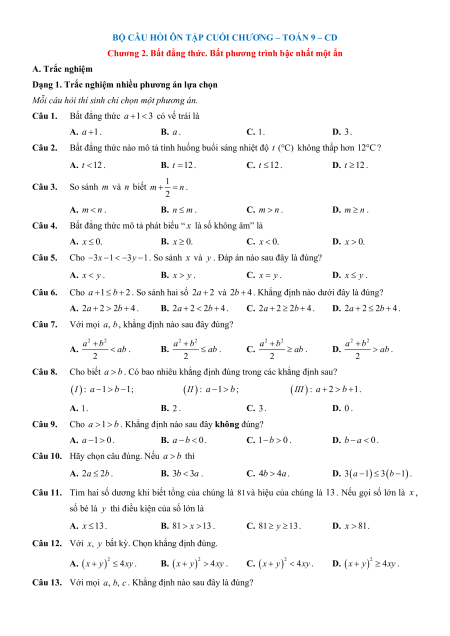 Chương 2. Bât đăng thưc. Bât phương trinh bâc nhât môt ân A. Trắc nghiệm