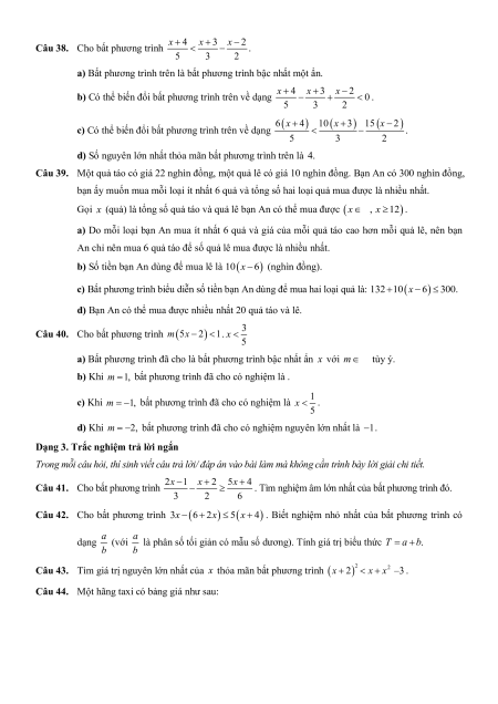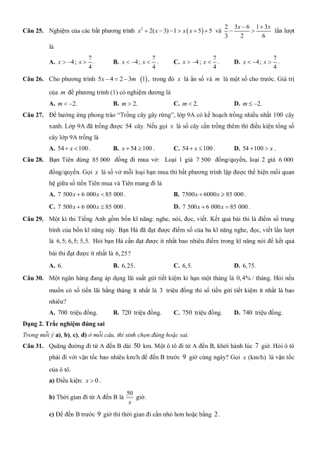 Câu 4. Bất đẳng thức mô tả phát biểu “ x là số không âm” là A. x 0. B. x 0. C. x 0. D. x 0.