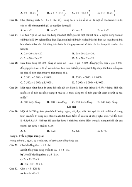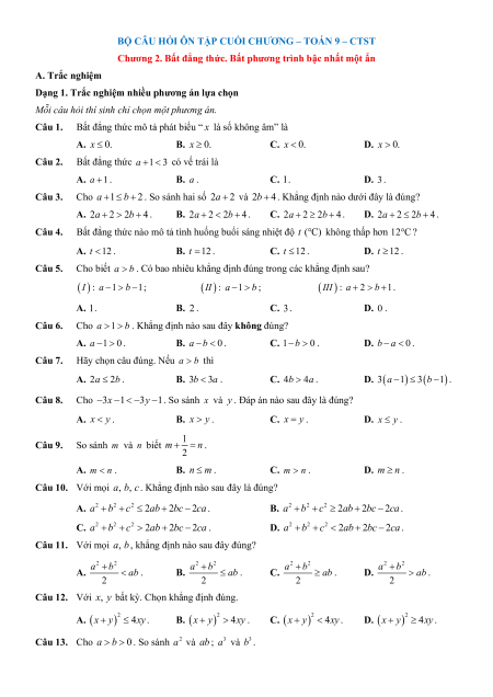 Chương 2. Bât đăng thưc. Bât phương trinh bâc nhât môt ân A. Trắc nghiệm