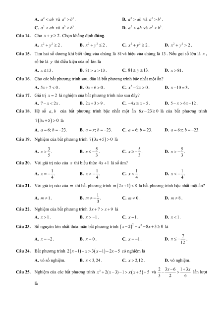 Câu 1. Bất đẳng thức mô tả phát biểu “ x là số không âm” là A. x 0. B. x 0. C. x 0. D. x 0.