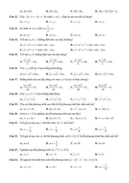 Câu 8. Bất đẳng thức nào mô tả tình huống buổi sáng nhiệt độ t (°C) không thấp hơn 12°C? A. t 12 . B. t 12. C. t 12 . D. t 12 .