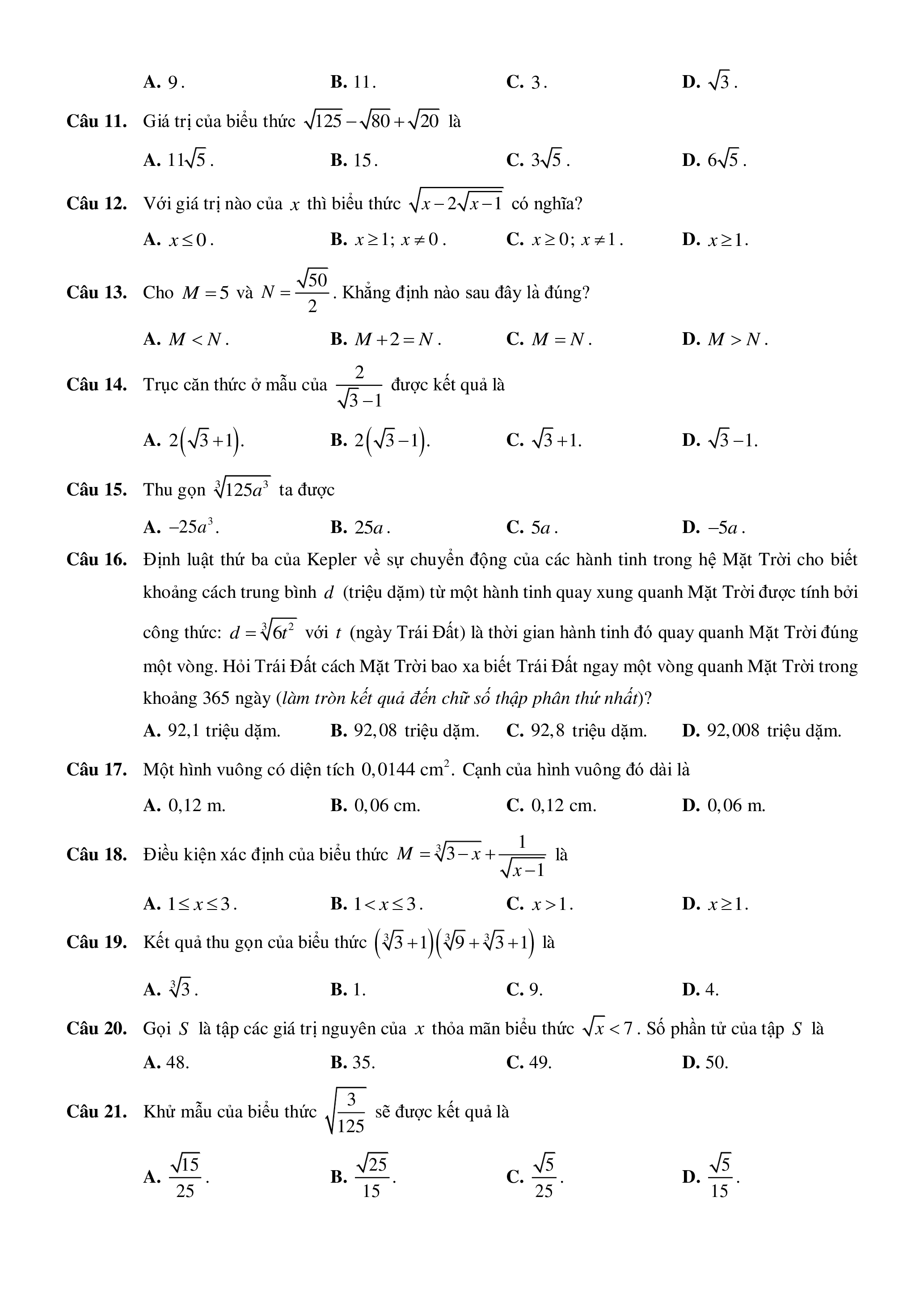 Câu 14. Trục căn thức ở mẫu của được kết quả là 3 1 A. 2 3 1 . B. 2 3 1 . C. 3 1. D. 3 1. Câu 15. Thu gọn 3 3 125a ta được A. 3 25a . B. 25a . C. 5a . D. 5 a .