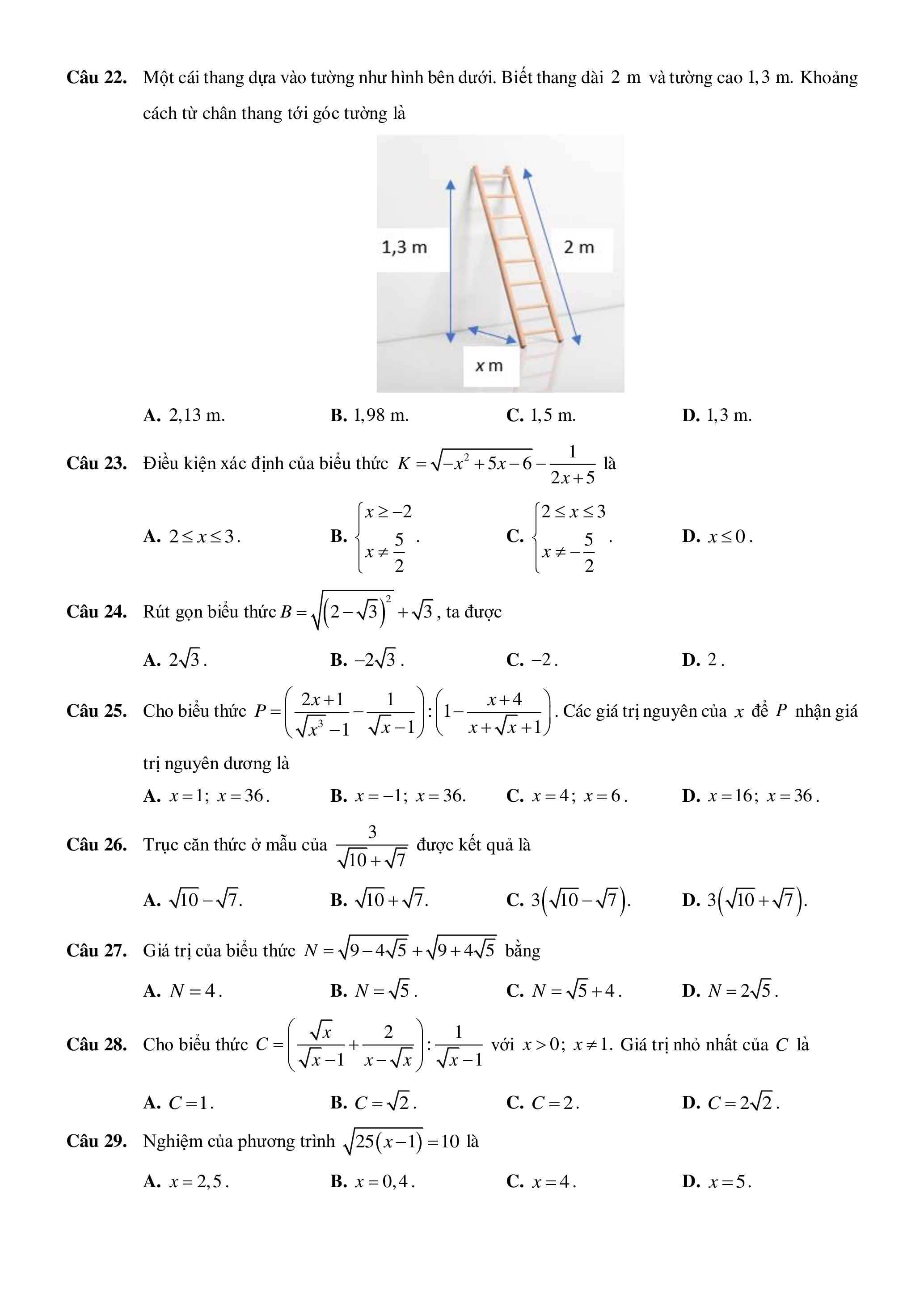 Câu 22. Một cái thang dựa vào tường như hình bên dưới. Biết thang dài 2 m và tường cao 1, 3 m. Khoảng