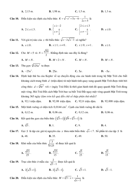 Giá trị của biểu thức 125 80 20 là A. 11 5 . B. 15 . C. 3 5 . D. 6 5 . Câu 9.