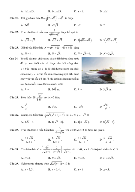 sau đuôi chiếc cano dài bao nhiêu mét? A. 5 m. B. 5 3 m. C. 9 m. D. 3 5 m. 4 a Câu 25. Biểu thức 2 2b với b 0 bằng 2 4b 2 a 2 2 a b A. . B. 2 a b . C. 2 a b . D. . 2 2 b
