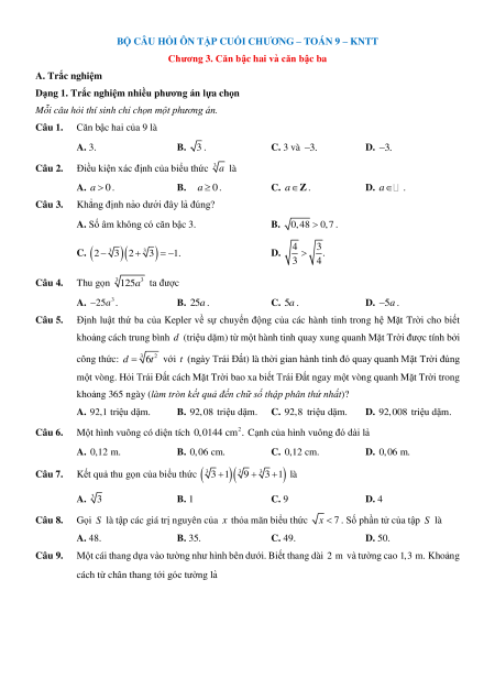 Chương 3. Căn bâ ̣c hai và căn bâ ̣c ba A. Trắc nghiệm