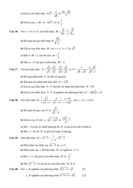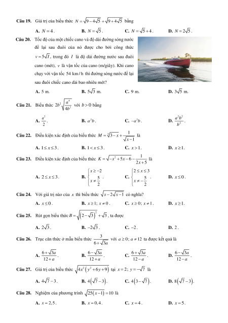 sau đuôi chiếc cano dài bao nhiêu mét? A. 5 m. B. 5 3 m. C. 9 m. D. 3 5 m. 4 a Câu 21. Biểu thức 2 2b với b 0 bằng 2 4b 2 a 2 2 a b A. . B. 2 a b . C. 2 a b . D. . 2 2 b 1