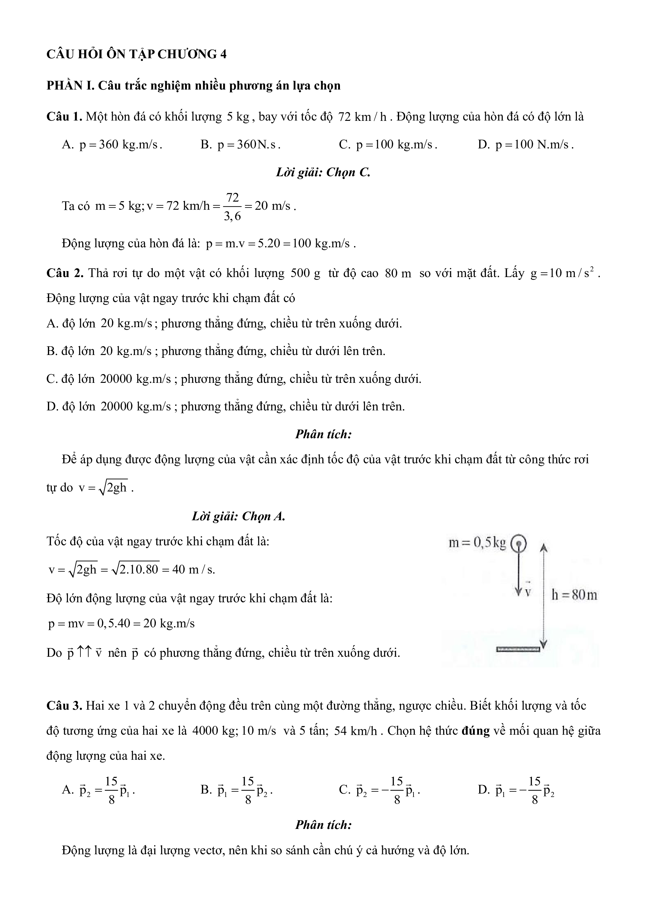 Câu 1. Một hòn đá có khối lượng 5 kg , bay với tốc độ 72 km / h . Động lượng của hòn đá có độ lớn là A. p 360 kg.m/s . B. p 360N.s . C. p 100 kg.m/s . D. p 100 N.m/s .
