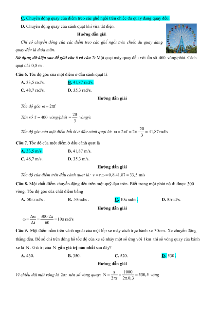 Câu 6. Tốc độ góc của một điểm ở đầu cánh quạt là A. 33,5 rad/s. B. 41,87 rad/s. C. 48,7 rad/s. D. 35,3 rad/s. Hướng dẫn giải