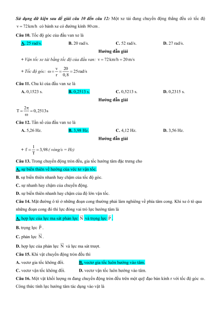 Câu 10. Tốc độ góc của đầu van xe là A. 25 rad/s. B. 20 rad/s. C. 52 rad/s. D. 27 rad/s. Hướng dẫn giải