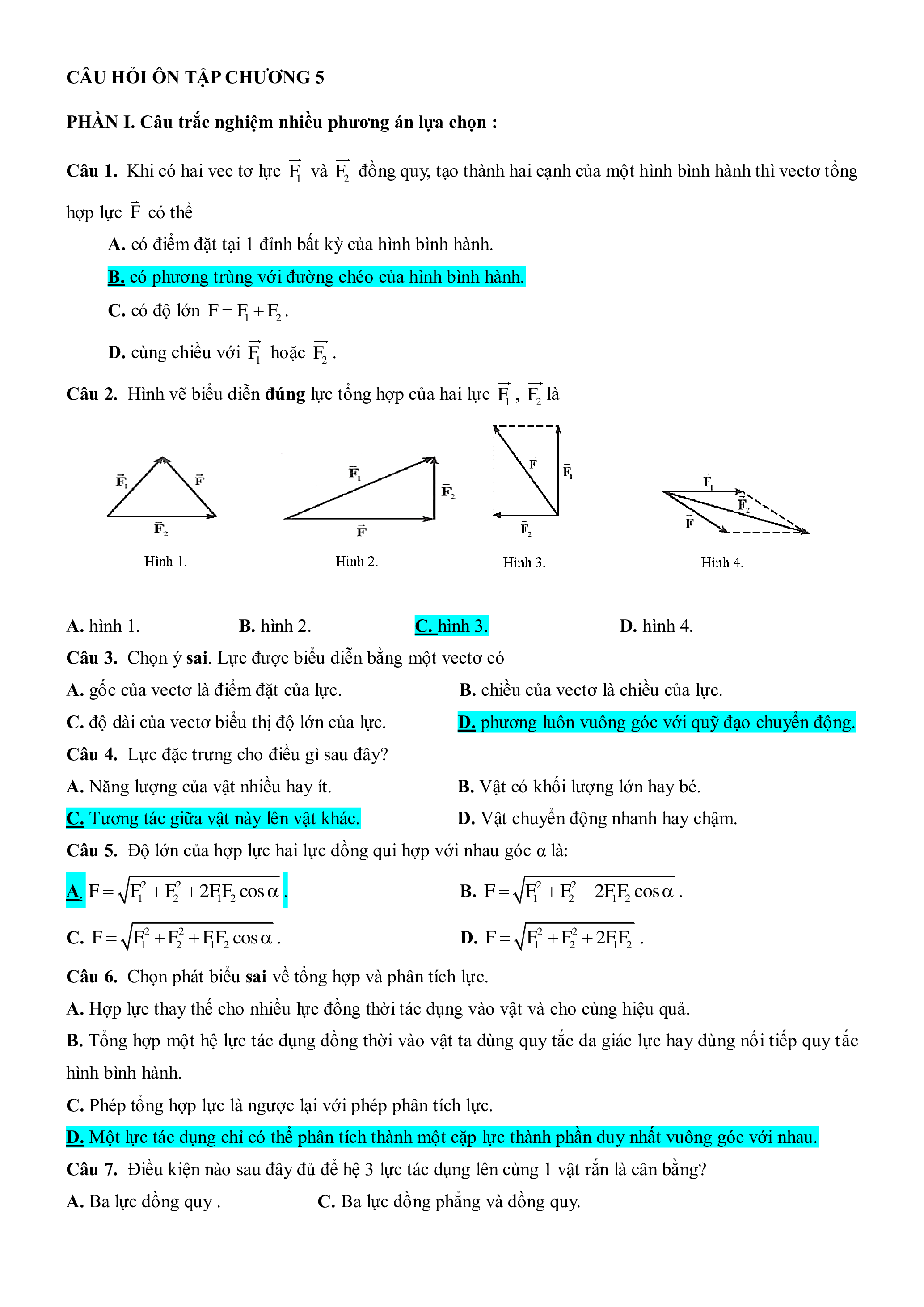 Câu 1. Khi có hai vec tơ lực F và F đồng quy, tạo thành hai cạnh của một hình bình hành thì vectơ tổng 1 2 hợp lực F có thể