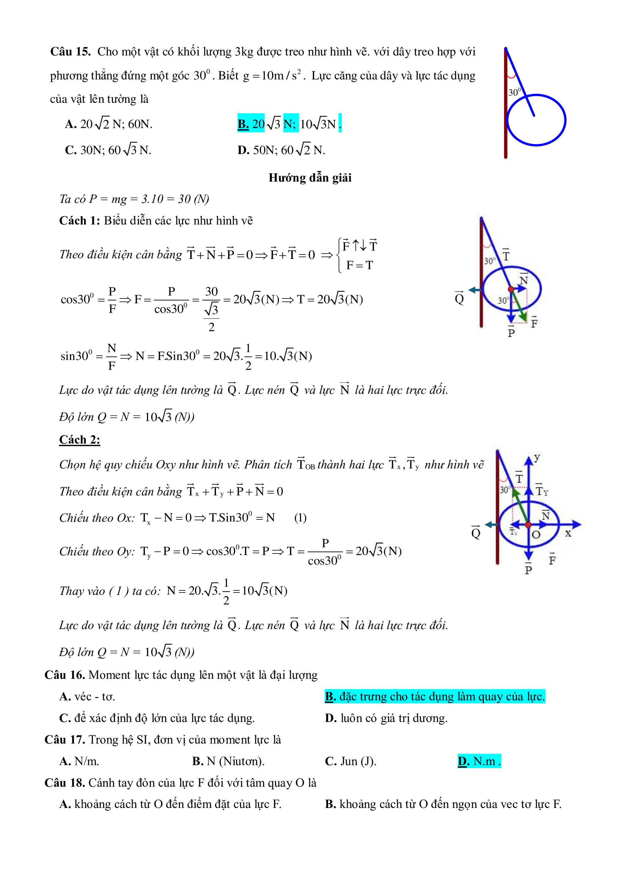 Câu 15. Cho một vật có khối lượng 3kg được treo như hình vẽ. với dây treo hợp với