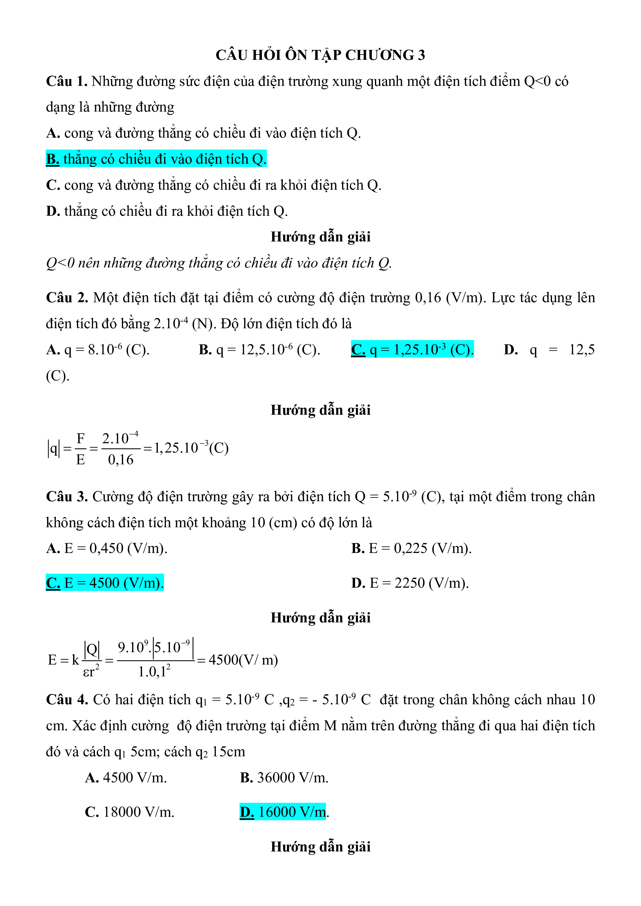 Câu 3. Cường độ điện trường gây ra bởi điện tích Q = 5.10-9 (C), tại một điểm trong chân