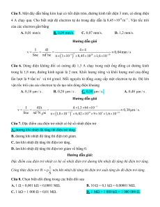 vận tốc trôi của các electron tự do tạo nên dòng điện khoảng A. 0,18 μm / s . B. 0,28 μm / s . C. 0,38 μm / s . A. 0,48 μm / s . Hướng dẫn giải 3 I 4IA 4 1 ,3 64 1 0 v 0,38 m / s. 2 Sne d N e 3 1,810 2 23 3 19 A