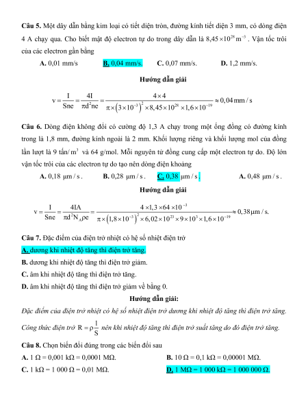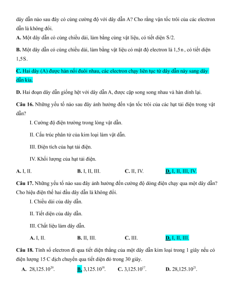 Câu 16. Những yếu tố nào sau đây ảnh hưởng đến vận tốc trôi của các hạt tải điện trong vật dẫn?
