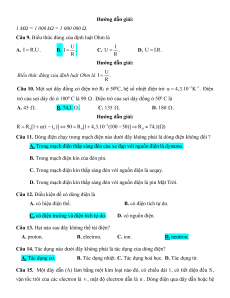 trở của sợi dây đó ở 1000 C là 90 . Điện trở của sợi dây đồng ở 500 C là A. 45 . B. 74,1 . C. 135 . D. 180 . Hướng dẫn giải: 3 R R [1 (t t )] 90 R [1 4,3.10 (100 50)] R 74,1( ) 0 0 0 0