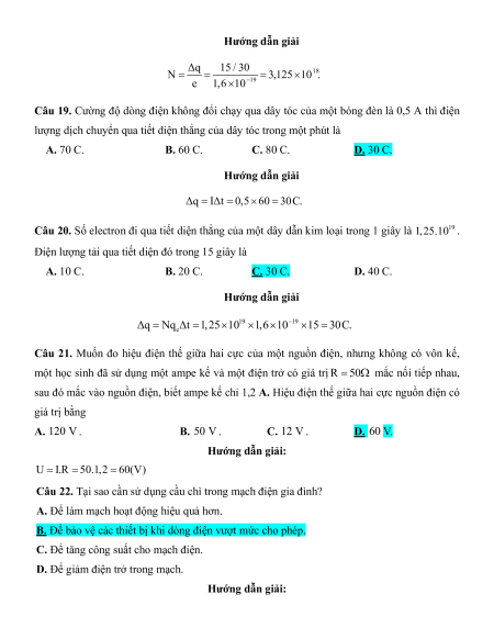 Câu 18. Tính số electron đi qua tiết diện thẳng của một dây dẫn kim loại trong 1 giây nếu có