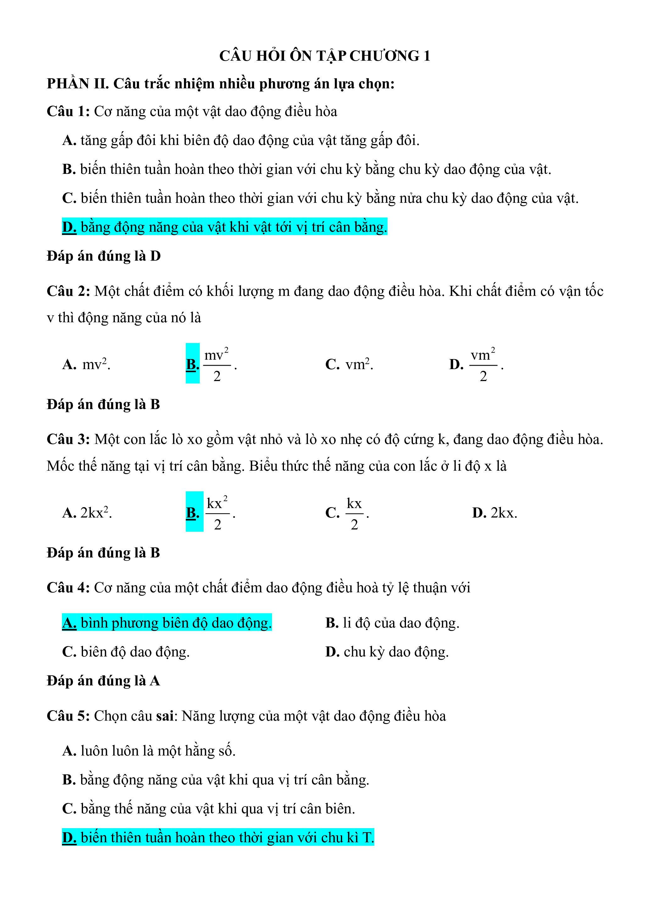 Câu 1: Cơ năng của một vật dao động điều hòa