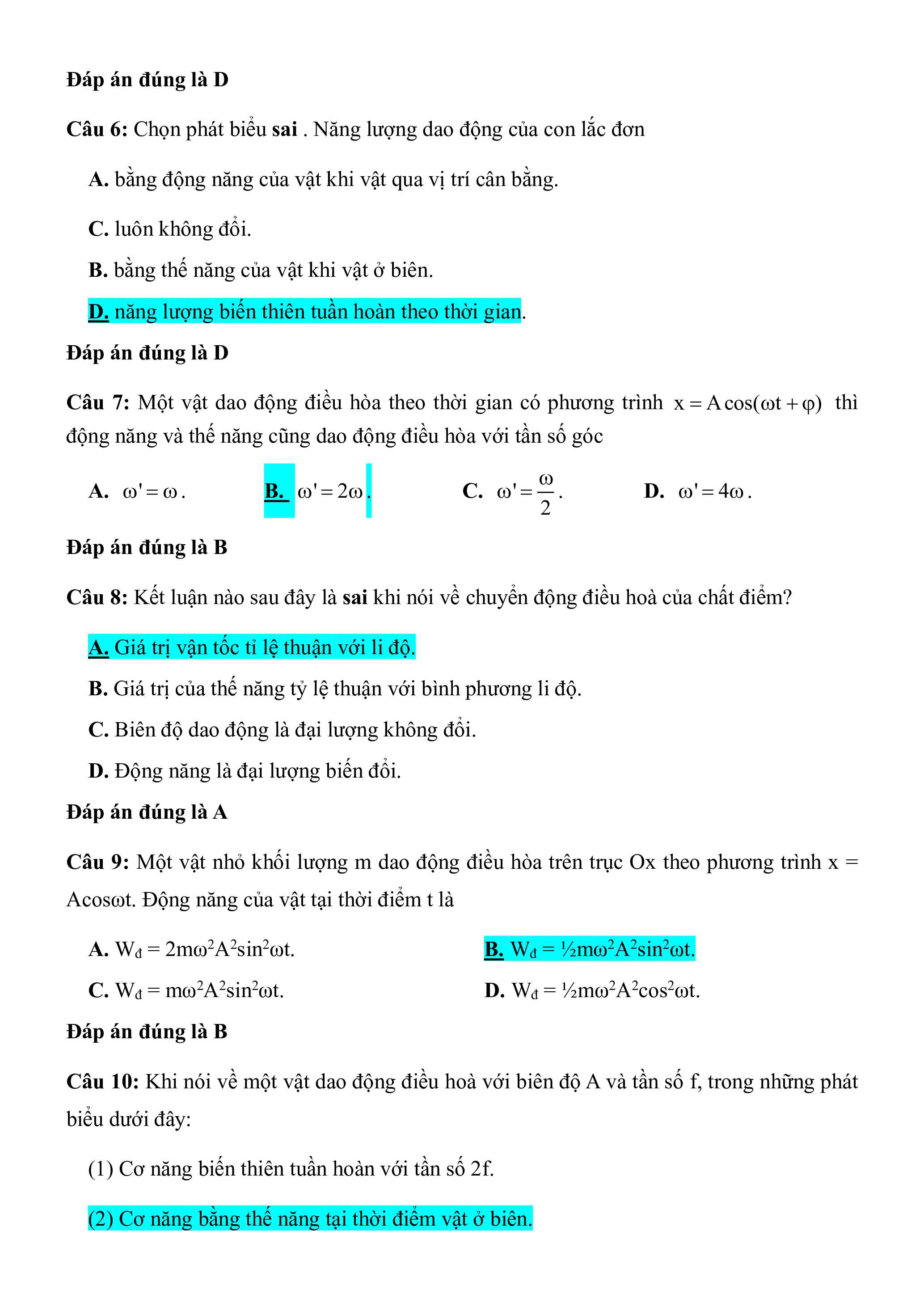 Câu 5: Chọn câu sai: Năng lượng của một vật dao động điều hòa